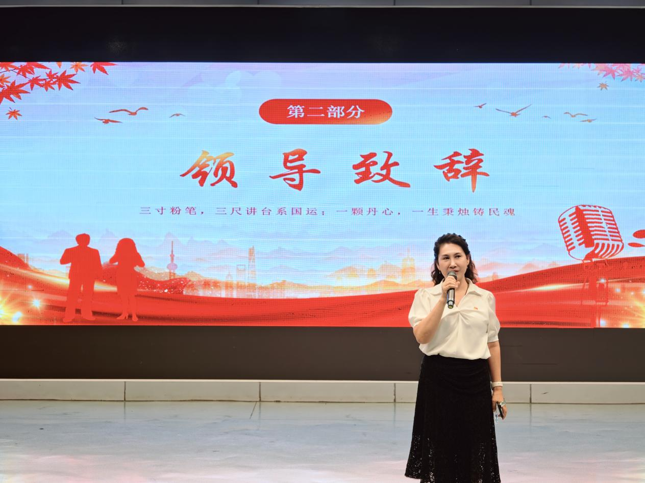 随后,学区党委书记王晓波致辞,她向辛勤耕耘在教育一线的全体教职工致以节日的问候和崇高的敬意。王书记指出,过去一年,东区二学区教师队伍在课程改革、德育创新、学生全面发展等方面取得了显著成效,涌现出一批爱岗敬业、勇于创新的先进代表,为学区教育质量的稳步提升作出了重要贡献。她强调,学区将始终把教师队伍建设摆在优先发展的战略位置,持续完善培养机制、搭建成长平台,全力支持教师们专业发展。同时,王书记鼓励全体教职工要深刻领会教育家精神的内涵,以“躬耕教坛、强国有我”的使命担当,不断提升育人本领,努力培养更多德智体美劳全面发展的社会主义建设者和接班人。