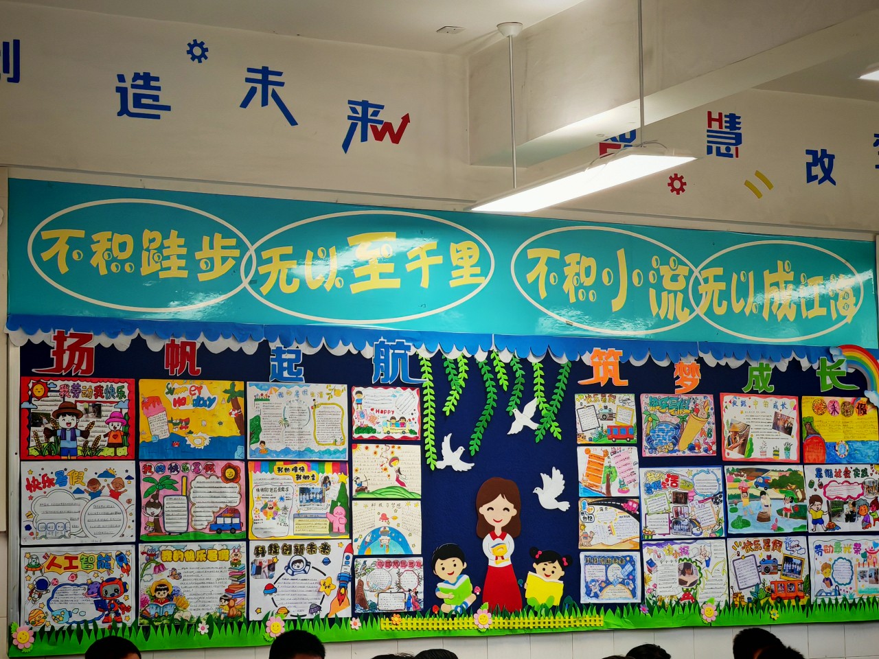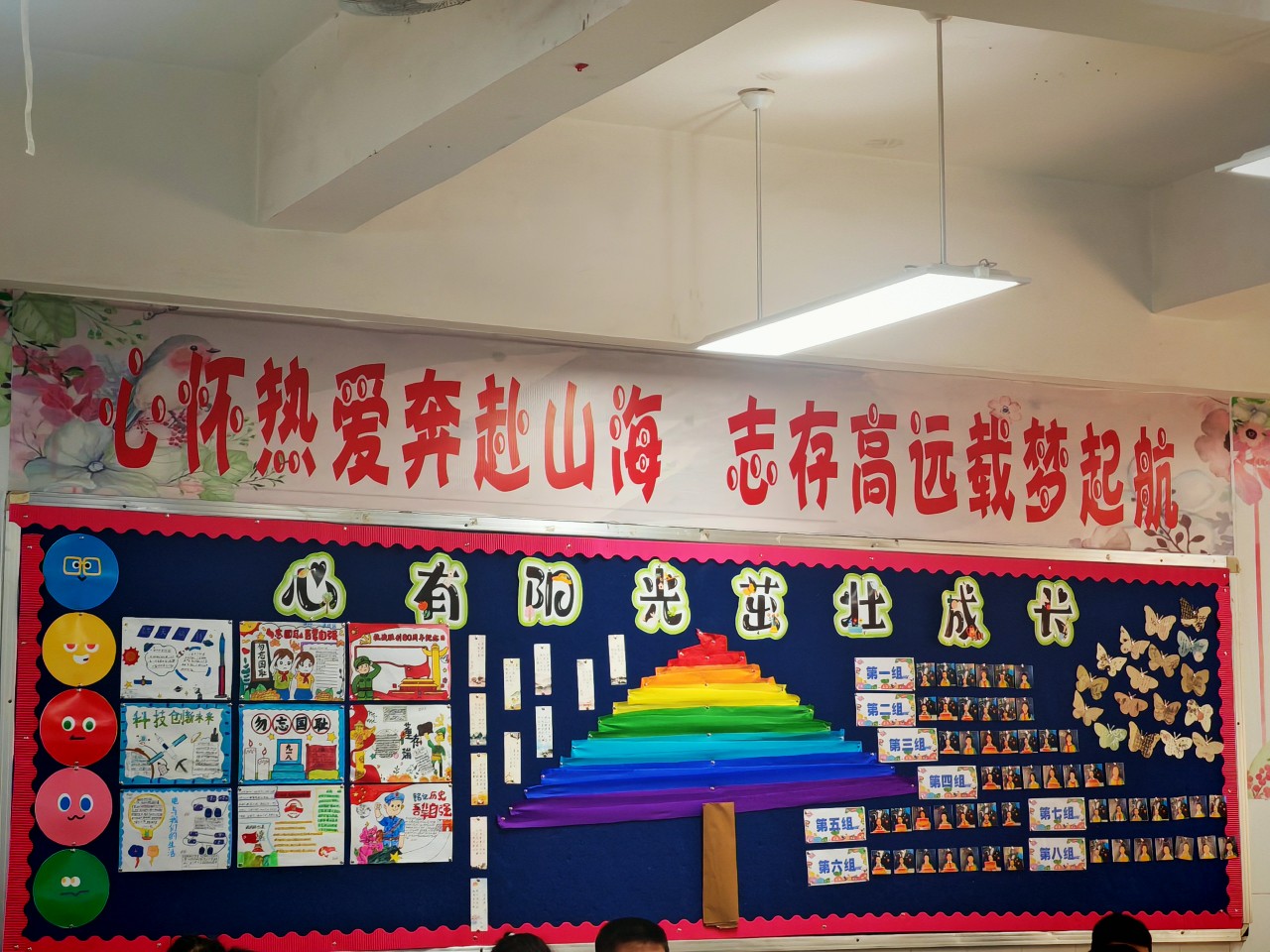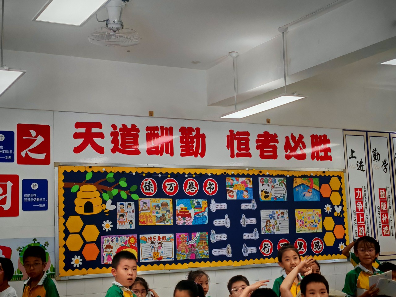 教室内,班级文化建设更是百花齐放、各具特色。有的教室墙面贴满学生手绘的卡通伙伴,连图书角都穿上了“彩虹衣裳”;有的班级聚焦“节气里的中国”,用剪纸、绘画呈现二十四节气的民俗与故事;还有许多同学变废为宝,用牛奶盒、旧纸箱做成收纳盒、小摆件,既环保又美观。每一处布置都出自孩子们的巧手,藏着他们对班级的热爱和无限的想象力。