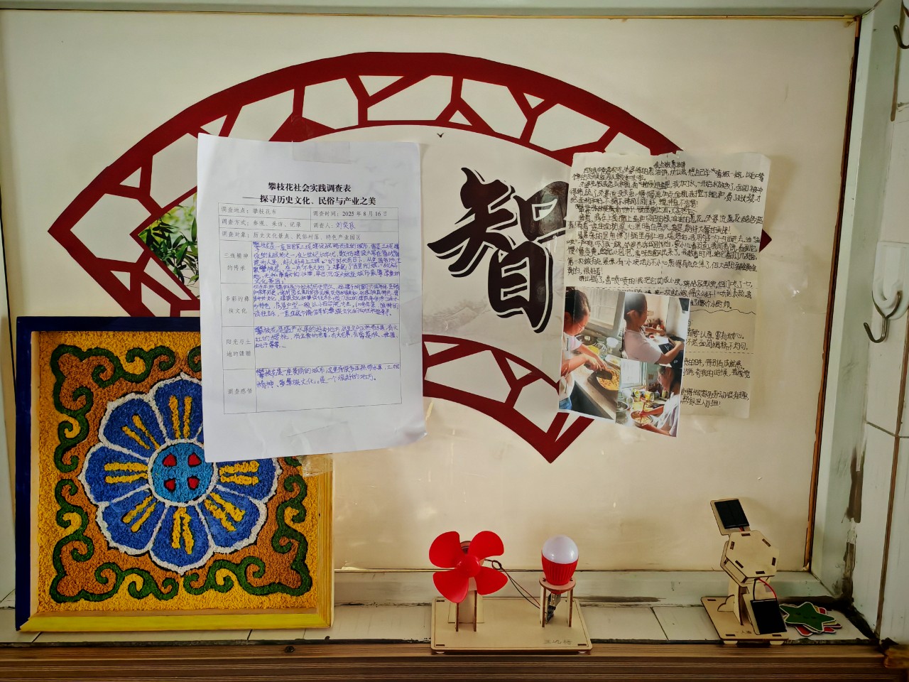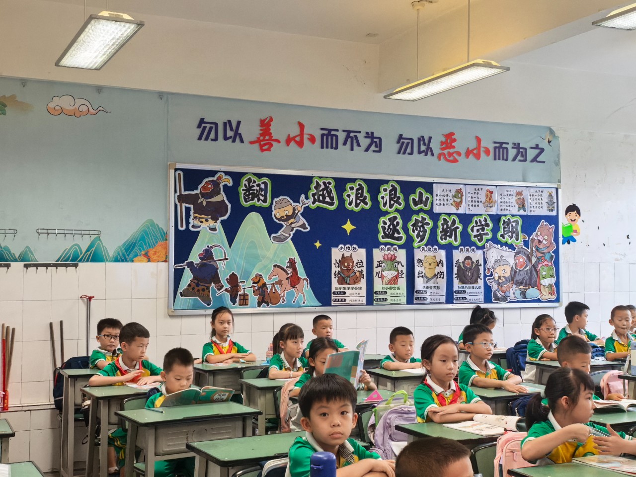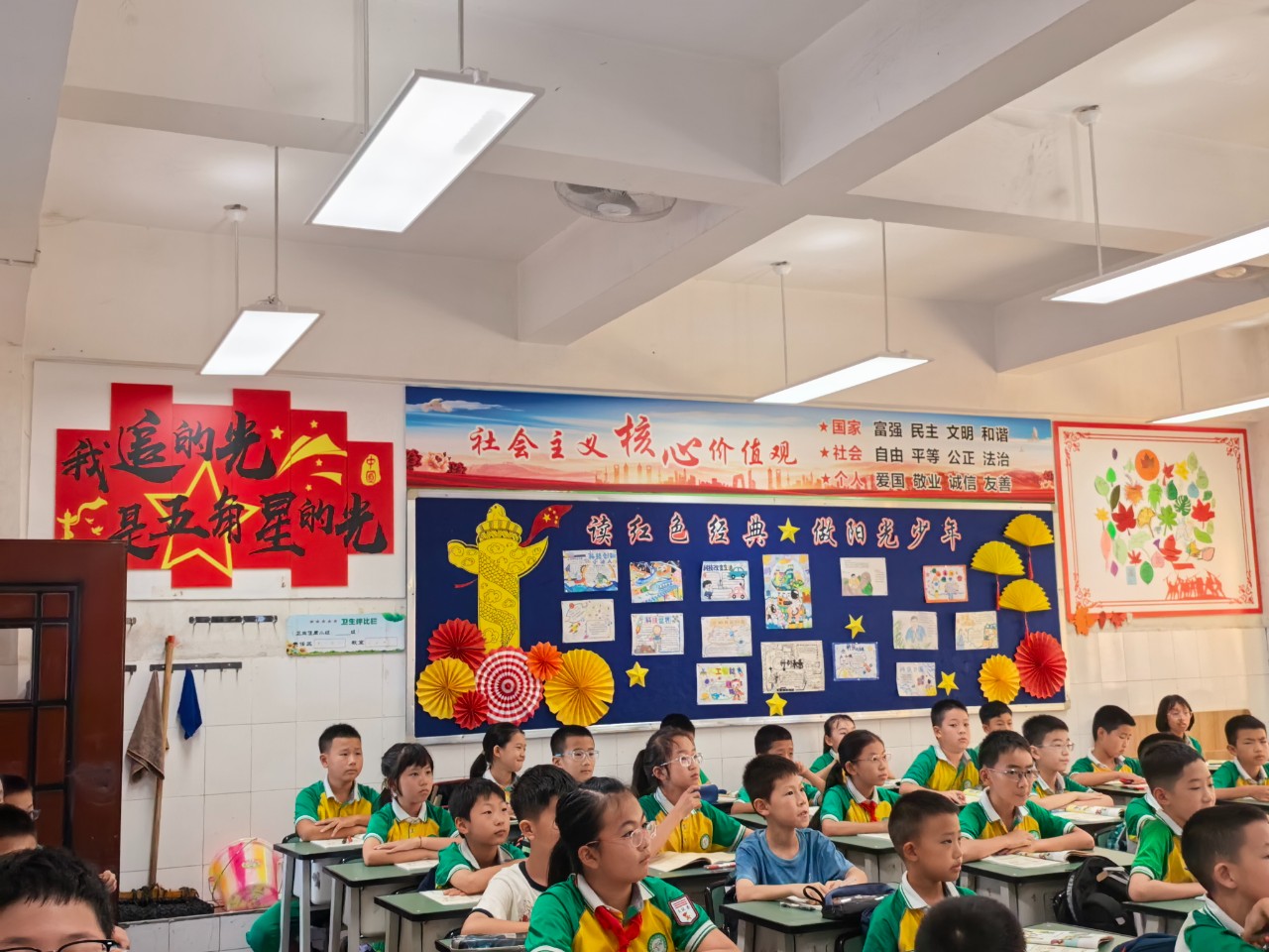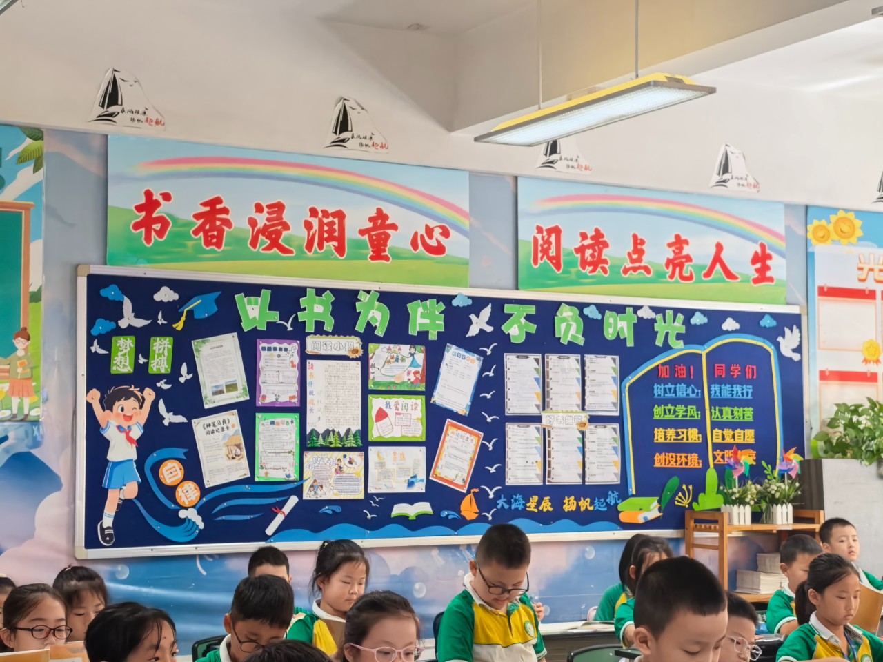 教室内,班级文化建设更是百花齐放、各具特色。有的教室墙面贴满学生手绘的卡通伙伴,连图书角都穿上了“彩虹衣裳”;有的班级聚焦“节气里的中国”,用剪纸、绘画呈现二十四节气的民俗与故事;还有许多同学变废为宝,用牛奶盒、旧纸箱做成收纳盒、小摆件,既环保又美观。每一处布置都出自孩子们的巧手,藏着他们对班级的热爱和无限的想象力。